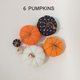 Decor: 4 large (approximately 1.5" height X 3" width) and 2 small (approximately 0.5" height X 1" width) pumpkins.