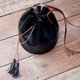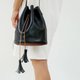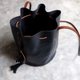 + Crafted from cowhide leather, the durable bag features a circular bottom, a side drawstring closure and a thick long leather strap to wear on the shoulder or crossbody.