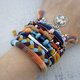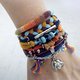 充满异国情调的彩色吉普赛手链套装,由两个堆叠的手链制成。一种是用天然麻纱线和彩色棉线制成的钩针管手镯。第二个多股手链由 T 恤纱线、绿松石算盘珠、多面玻璃珠、种子珠、银金属元素、管、链、末端和扣环制成。部落头像吊坠、棉质流苏和镶有水晶的硬币。波西米亚色彩:南瓜色、知更鸟蛋色、柑橘色、焦橙色、海军蓝、沙漠沙色和红海湾色。