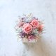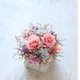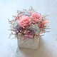 - 由永生花玫瑰.绣球.星辰花.法国白梅.卡氏比亚制作而成的盆花 盆花尺寸宽约12-16cm 高约14-15cm