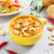 严选柔嫩鲜美姬菇搭配口感肥厚的杏鲍菇并配上花椰菜、马铃薯、红萝卜、豌豆多种蔬菜,用香茅、南姜、绿辣椒等泰式特有香料佐椰奶熬煮成酱,辛辣椰香的风味,淋在饭上一口接一口。