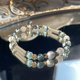 这条手链使用了小高品的透体切钻海蓝宝,透体魔鬼海蓝宝、蓝光拉长石、月光石、长圆形灰玛瑙编织而成。