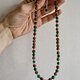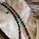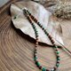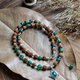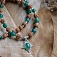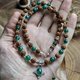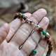 印度圣石(Rudraksha)念珠(5毫米)与澳洲玉(Chrysoprase)小颗(5-6毫米)串成。手工制作的坠饰,采用925纯银镶嵌一颗椭圆形的绿色澳洲玉。