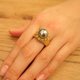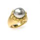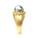 中央镶嵌着一颗灰色的黑蝶珍珠,周围环绕着黄K金制成的小巧玫瑰。