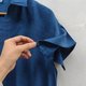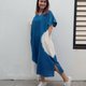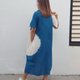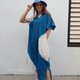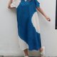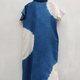 衬衫领短袖中长连身裙,下摆开臂,宽松设计,舒适。薄棉布印有大白圈的酷靛蓝色扎染,透气舒适。两侧都有口袋。
