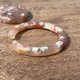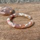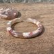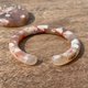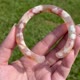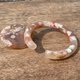 介绍:底色偏橘红色、带透明感,像是葡萄柚果冻的感觉。全镯都带色带花,飘散着粉红、嫩绿的色带,玛瑙花有一朵明显成形,带花瓣与花心,搭配在色带旁边,就像是陪衬在彩虹旁边的云朵,十分有趣!
