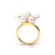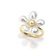 这款无核珍珠花戒,缀以圆润光泽的白蝶珍珠,宛如生命力盎然的五片花瓣。花蕊则以黄色无核珍珠点缀,当然,皆为天然原色。