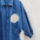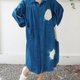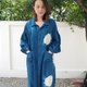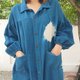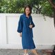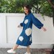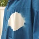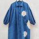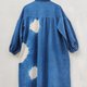 衬衫领连身裙,正面纽带开合,配有木纽带。胸部下方和袖子上有荷叶边细节。长泡泡袖,松紧袖口。超大宽松设计,穿着舒适。采用透气竹棉布料制成,不透明,无需内衬。两侧均附有侧袋。美丽的靛蓝扎染,带有独特的大圆形白色图案。柔软舒适,非常适合休闲日。