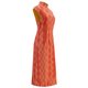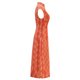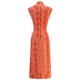 这件橙金相间的高档真丝长衫图样灵感源自风靡上世纪六十年代香港的复古防水布图案,设计从通花铁闸衍生,突出铁闸门精雕细刻的一流工艺。