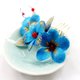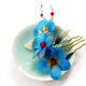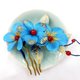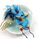 👉设计评点:承袭古典韵味,这款发梳饰品以传统绒花为设计核心,蓝花与金线描绘,展现戏曲的风范与别致。