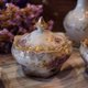 英国早期仕女梳妆台瓷器五件组,瓷面上有着淡紫色花卉搭配波浪边形的描金设计,而在香水瓶罐及瓷盖壶上方则具有独具匠心的三角体形状,饰品挂盘上独特的不规则造型也很适合摆放自己心爱的配件收藏。