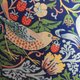 在花朵与绿叶交织的画面中,鸟儿们正偷偷采摘鲜美可口的草莓,画家运用错综鲜明的色彩,丰富了画作的生动感,却不显俗气;反复的图案排列,除了描绘小鸟偷吃草莓的景象,在William Morris威廉·莫里斯*双构图*的安排下,特定的局部形成了看似人脸的图样,展示出极佳的创意性。特别的是,这件作品是William Morris威廉·莫里斯第一次使用东方的*靛蓝印刷技术*,也就是现代所称的*蓝染*,成品呈色相较以往也更加精细。直到今日,还是能在各大品牌看到许多*William Morris威廉·莫里斯*的创作,与之结合出新的火花。
