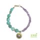 Pastel amazonite and amethyst , contrast in colors and shapes with 18 k gold plated Turkish evil eye charm.