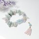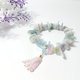 严选绿柱石家族所有色系宝石(海蓝宝、摩根石),雕以金刚杵(智慧、平安)珠饰、花(花开富贵)珠饰、与随型扁珠,宝石晶体净透、水光匀净、闪彩虹星光,优雅环绕手腕,宛如花苞包裹手腕,暨是柔美婉约,也是大器富贵。