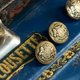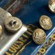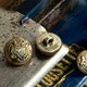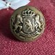 以狮子与王冠盾徽为主题的法国古董黄铜钮扣,立体浮雕贵族纹章风格,正面可见两侧对称狮子、中央条纹盾牌与上方皇冠,下方还有飘带文字,是欧洲传统家徽、军服与礼服外套常用的钮扣,随时间产生自然包浆,呈现带旧痕的暗金光泽。