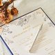 【商品材质】:书约夹(纯手工烫金在缎面外壳上,质感厚实),结婚书约(340磅水彩纸、烫金文字)