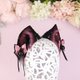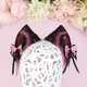 - Dark Mauve Cheshire Cat Ears Ears are: - approximately 2,5 inches tall - fully wired and posable on the metal headband - decorated with rhinestone accents, hoops, moon and star piercing and removable bows with black bells