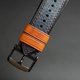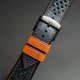 表带设计:Racing 风格,带有打孔设计。表带厚度约为 3.5 毫米(靠近表壳处)与 2.5 毫米(孔洞处与表扣端)。