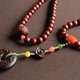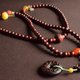 本品精挑天然小叶紫檀8mm园珠制作108念珠手串项链,吊坠可在前、在后或在侧,做项链佩戴。也可做手链手串佩戴,也可做手持。。纯天然材质,无着色无优化,质地油润透红,纹理清晰,底色纯净均匀,润度高,手感熨帖光滑。纯天然满肉满色南红三通与满肉满色南红隔珠,以天然紫檀平安扣搭配天然祥云雕刻件,天然碧玉圆珠,天然南红樱桃红圆珠,天然琥珀满蜜俏色圆珠做吊坠装饰。平安扣上精雕祥云纹与卷草纹。南红三通色泽明艳,有清晰纹理,樱桃红圆珠透光可见朱砂点明显。另三处背云,一为天然南红樱桃红圆珠加天然琥珀金绞蜜鼓珠,搭配天然手编树叶一为天然保山南红满色回纹雕刻珠加天然琥珀满蜜俏色圆珠垂坠天然琥珀满蜜俏色莲花雕刻件加天然碧玉圆珠,天然满肉满色南红小圆珠的小吊坠。一为天然南红樱桃红圆珠加紫檀回纹大圆珠。整体古色古香。