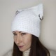 猫耳毛线帽钩针编织。带猫耳的白色帽子。蓬松方形毛线帽手工编织