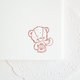 描绘一只手拿刺绣框,细心绣着小爱心图案的泰迪熊印章。