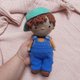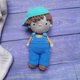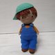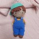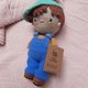 手工钩编柔软的男孩娃娃衣服。帽子和工作服可以脱下并重新穿上。脸颊和鼻子涂上干粉彩。