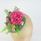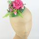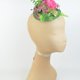 绿色剑麻草帽底,点缀着鲜艳的粉红牡丹、绿色与粉红绣球花、蘑菇及叶饰。