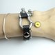 - 这款手链用了厚重的不锈钢马蹄扣做为重点, 搭配一些铆钉类的螺丝做为装饰, 再加上不锈钢链条, 多点层次也更带出金属和皮革(人工合成皮) 的摇滚风格。