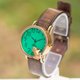 OLIE的父亲采用独创的木版染色制作出带有木头纹路的深褐色表带,更加凸显出翡翠绿的彩色玻璃。