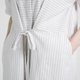 - 宽松版型、棉质混纺、腰间造型绑带、条纹拼接设计、下摆弧形设计。