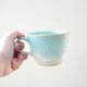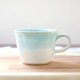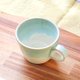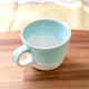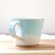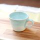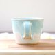 在塑造成简约方形马克杯的形状后,先施以光泽感的洁白釉药,再叠加一层水蓝色釉药。