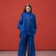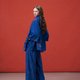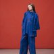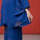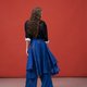 此款设计以 Oversize 廓形的宽松斗篷作为基础版型,将裙装结构解构重组,巧妙融合于衬衫之中。领口部分经过精准计算,特别设计成如同松紧裤头般的立领,贴合腰线,同时增添细节巧思。下摆呈现伞状设计,穿着时自然垂坠,形成优雅柔和的波浪曲线,从背面望去尤显典雅。