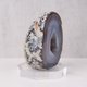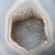 此颗玛瑙水晶洞的特色在于洞深汇财聚气,晶牙细小且密布,就像一整片的砂糖颗粒布满在上面。而玛瑙层的部分渐层明显,可以看到白色灰相间的玛瑙生长痕迹。长椭圆的外型,配合上天然生长的痕迹,从侧面来看宛如达摩不倒翁的意象,是一颗充满吉祥福气寓意的玛瑙水晶洞。
