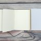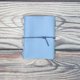 这款现代手工编织笔记本采用打蜡棉线(白)缝制。盖子采用麂皮布料(天蓝色),还附赠一条蓝小天鹅绒绳。