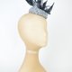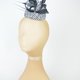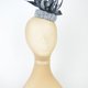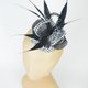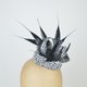 药盒帽底座采用塑胶树脂制成,覆盖黑白色织物,搭配丝网扭结、面纱与造型羽毛装饰。