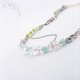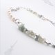 以兰花搭配为发想,我们以白剑兰作为主轴出发,以灰白色调的原石搭配五金,以及珍珠的组合。透过冰晶透明的晶石,链接湖水绿的珠串,延伸到石斛兰意象。我们加入了相较缤纷的透色原石,就如同在花器中插入一株真诚活泼的蝴蝶兰。