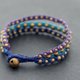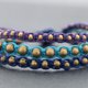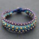 这是一款手工编织的手链,由紫色,深蓝色和浅蓝色棉线蜡编织而成